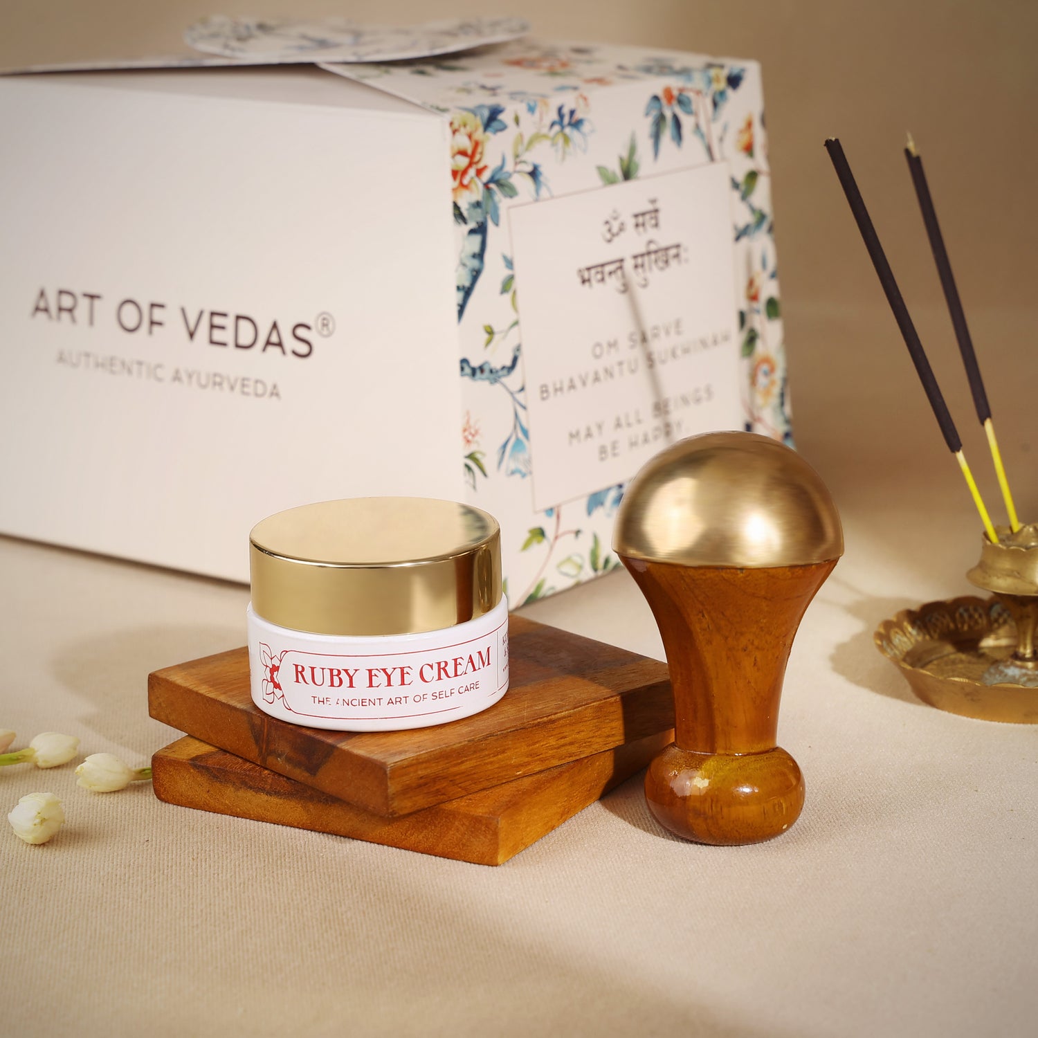 Experience the Ayurvedic practice of Netra Abhyanga, a rejuvenating ritual for the delicate eye area, with the Kumkumadi Eye Care Kit. This kit includes the Ruby Eye Cream, a luxurious blend of saffron and Ayurvedic herbs to hydrate, brighten, and reduce the appearance of dark circles and fine lines, and the Mini Kansa Wand, designed for precise marma point massage to restore balance and enhance radiance.