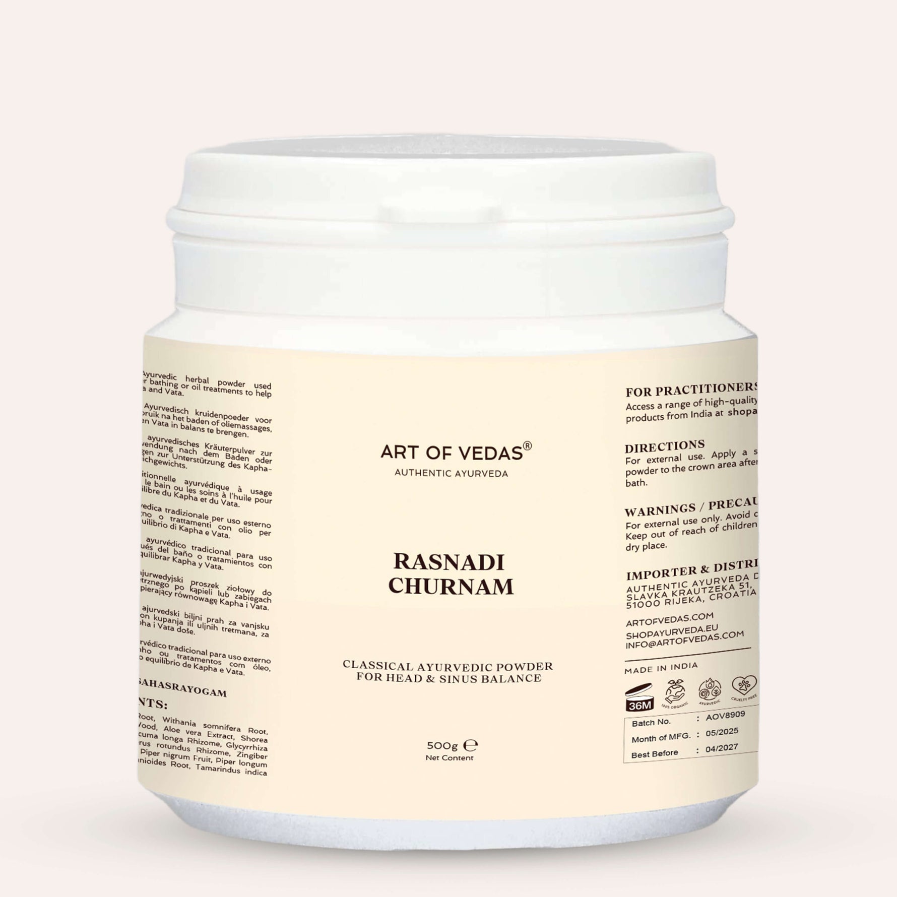 Rasnadi Choornam is a classical external-use Ayurvedic powder applied after head oil therapies or bathing. Traditionally used to prevent Kapha accumulation in the head and sinuses, it supports post-treatment balance and comfort. The formulation is based on ancient texts and combines herbs that balance Vata and Kapha in the head region.