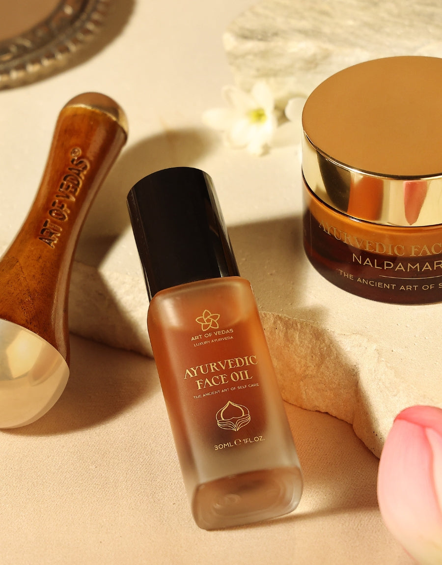 Entdecken Sie die Essenz wahrer Ayurvedic Schönheit mit unserem Ayurvedic Beauty Ritual Kit, einer Mischung aus alter Tradition und achtsamer Selbstfürsorge. Dieses sorgfältig zusammengestellte Set enthält unser hochwertiges Ayurvedic Face Oil und einen handgefertigten Mini Kansa Wand, inspiriert von jahrhundertealten Ayurvedic Praktiken.