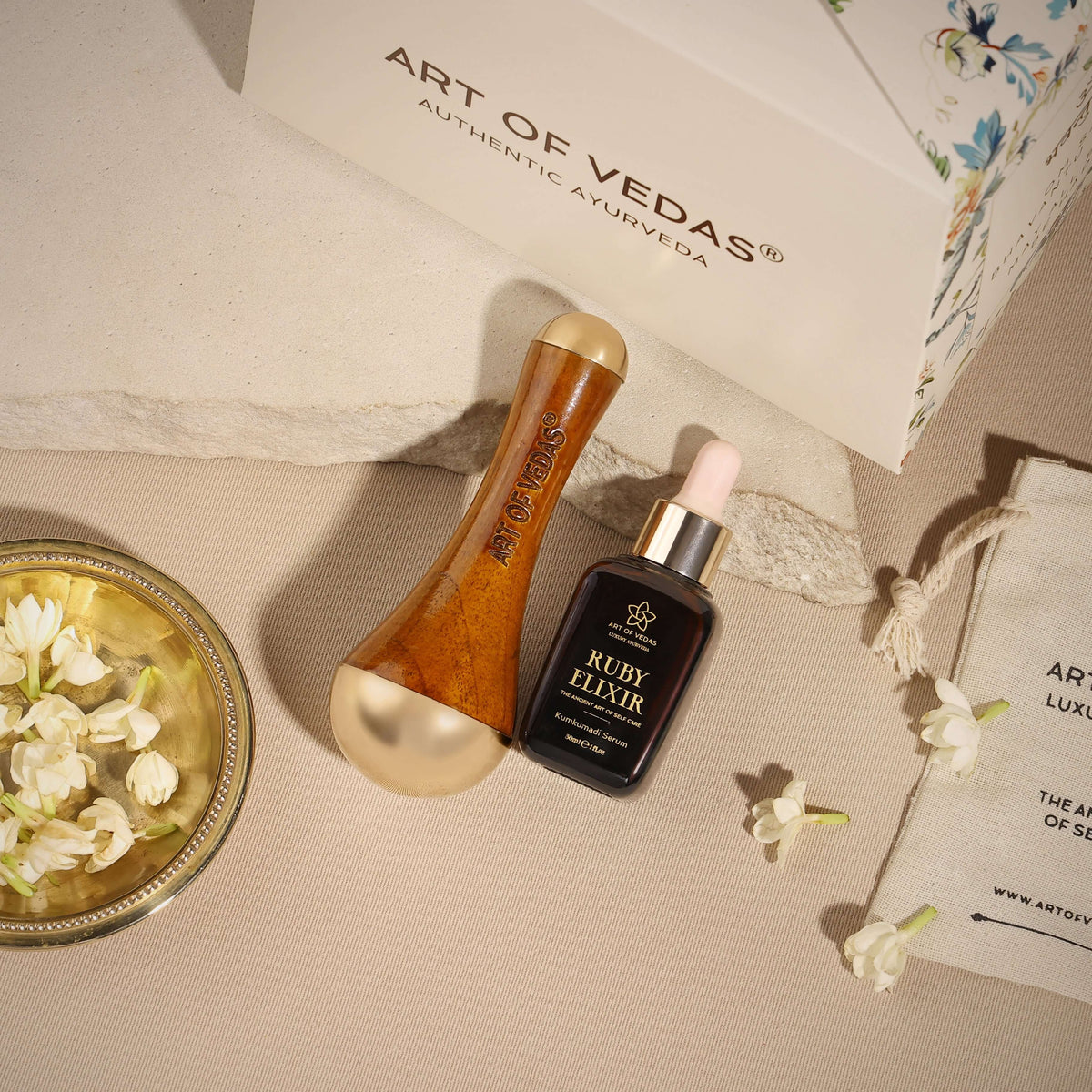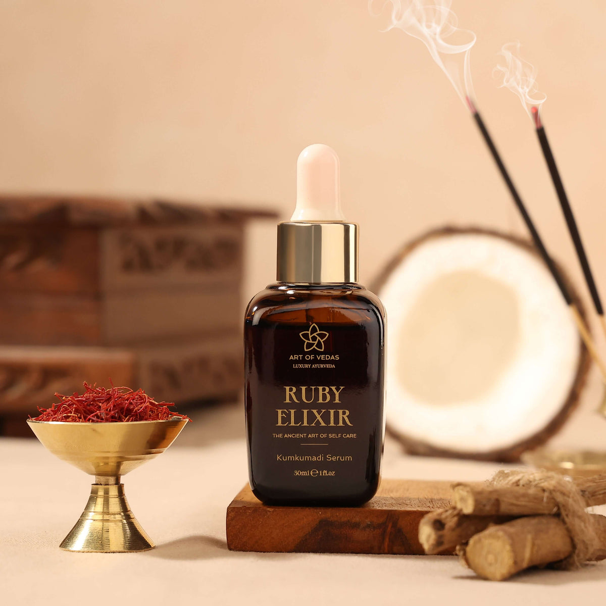 - Ruby Elixir Kumkumadi Serum (30ml): Eine luxuriöse Mischung aus Safran und ayurvedischen Kräutern zur Steigerung der Ausstrahlung, Verbesserung der Hautstruktur und Förderung eines ebenmäßigen Teints.