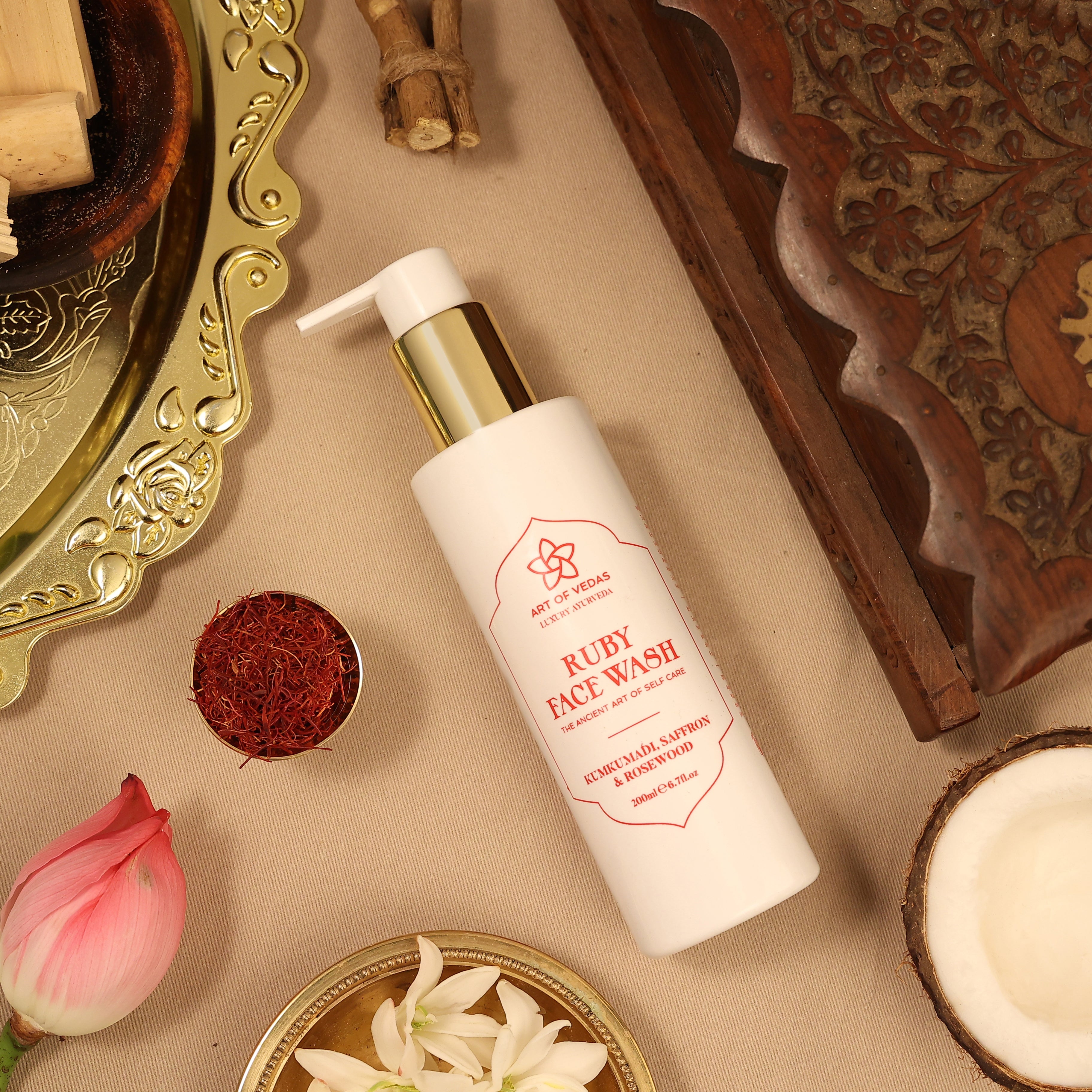 - Ruby Gesichtsreiniger (150ml): Ein sanfter Reiniger, angereichert mit Kumkumadi und Safran, der die Haut reinigt und gleichzeitig ihre natürliche Feuchtigkeit und Ausstrahlung bewahrt.